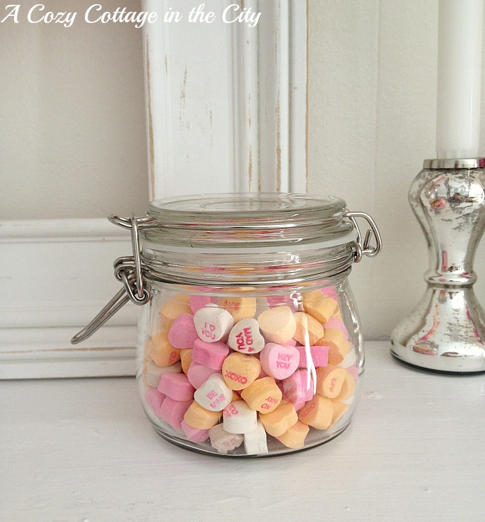 I then put the rest of the unused hearts in this glass container on my mantel for some fun pops of color! :)